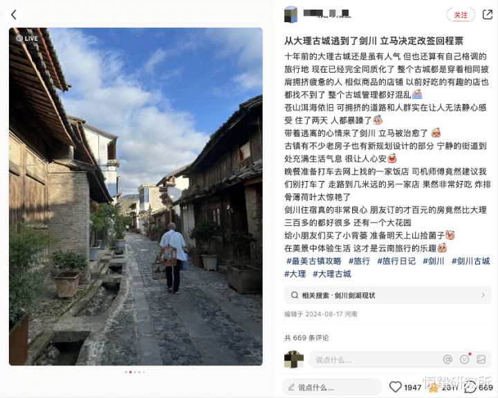 于是,旅客运行了新一轮的探寻。“反向旅游”渐成趋势,越来越多的东谈主转而寻找那些尚未被粗鄙融会的古镇。举例,好多前去云南地区古镇的旅客,首选贪图地已不再是传统热点的丽江古城、大理古城,而是巍山、剑川等更为小众的古镇。有旅客在支吾媒体上分享从大理古城转往剑川古城的经验,觉得大理古城已失去往日作风,充斥着同质化商铺、拥堵的东谈主流与相似的“旅客披肩”,而剑川则仍保留着生计气味与宁静氛围,体验更佳。