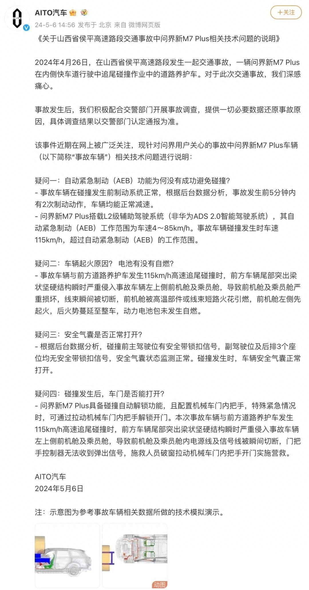 4月26日,一台问界新M7 Plus在山西省高速路段发生严重交通事故,激发了鄙俚关注,5月6日下昼shibo体育游戏app平台,AITO汽车官微肃穆发布对于这次事故的造访收尾《对于山西侯平高速路段交通事故中问界新M7 Plus关系时期问题的阐发》。