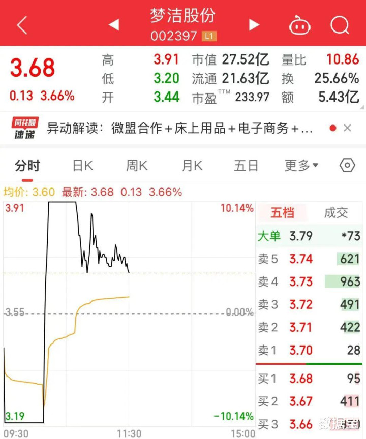 梦洁股份早盘演出“地天板”行情,股价从跌停拉升至涨停,而后开放涨停,未能齐全4连板。死心上昼收盘,该股高涨3.66%,成交量150.82万股,成交额5.43亿元,振幅达20%,换手率25.66%。