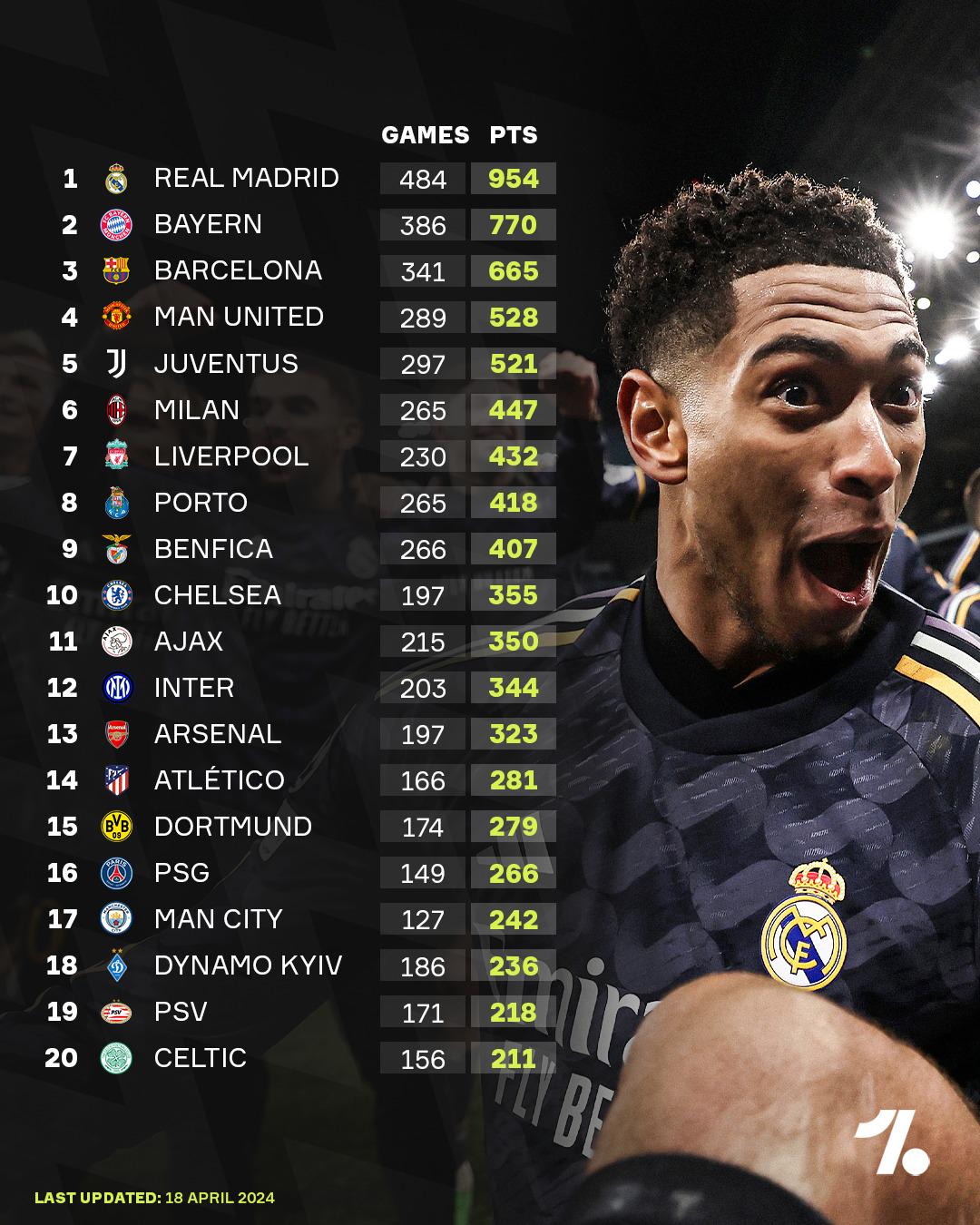 直播吧04月18日讯 足球自媒体onefootball统计了欧洲各队欧冠历史总分世博体育,其中皇萨仁不出不测列前3。