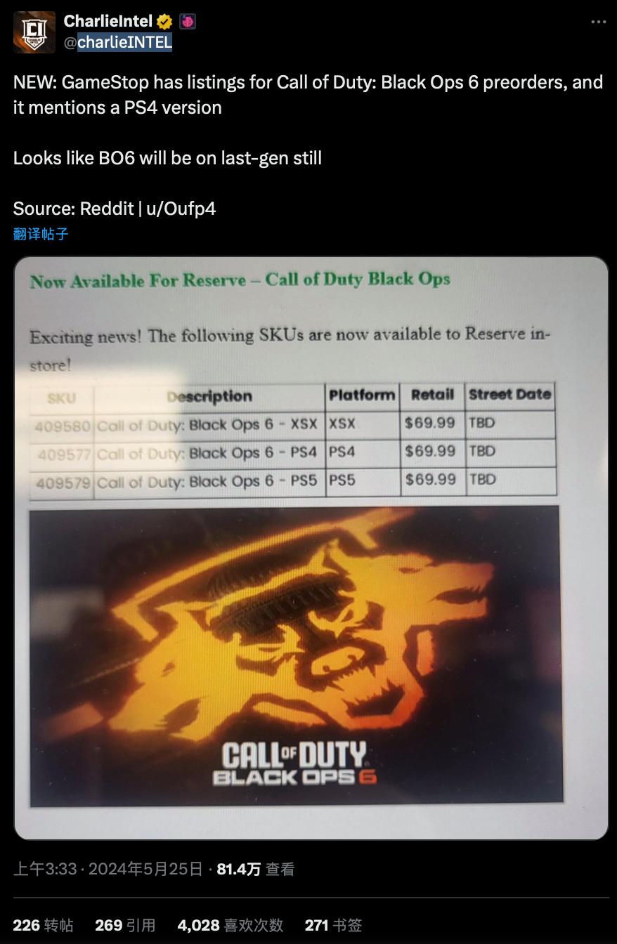 IT之家 5 月 25 日音讯,动视和微软最近厚爱公布了游戏《劳动召唤 21:玄色动作 6》,X 平台音讯源“CharlieIntel”今天共享了一张据称是游戏 GameStop “预购清单”的截图,其中闪现本作除了 PS5 和 Xbox Series X / S 版块外世博shibo登录入口,还将提供 PS4 版块。