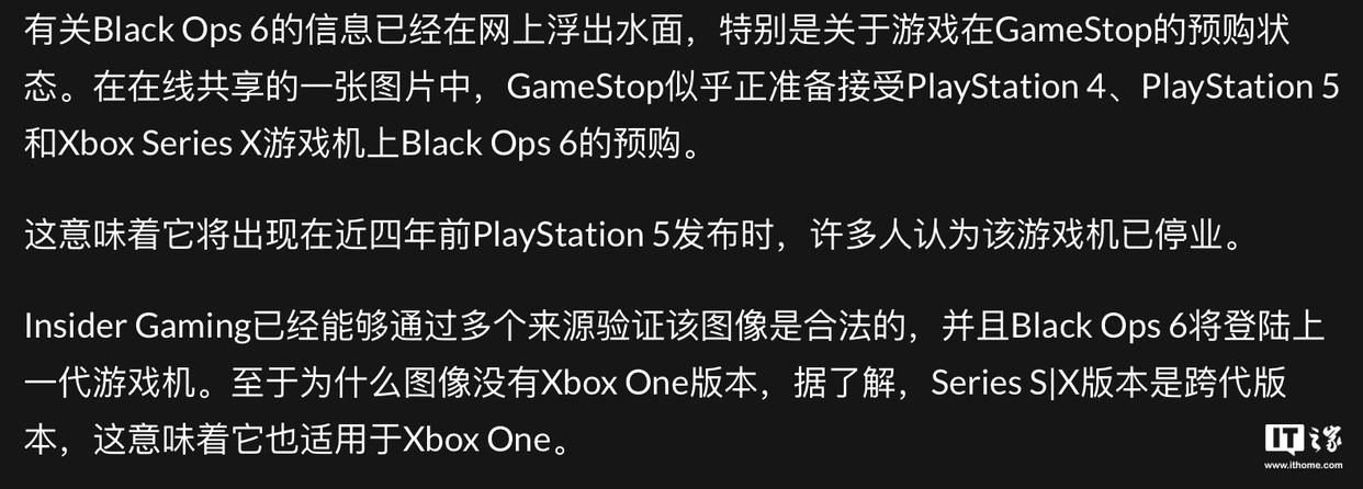 IT之家属目到,干系截图还取得了外媒 Insider Gaming 的阐述,该媒体宣称《劳动召唤 21:玄色动作 6》“果真将推出 Xbox One 和 PS4 版块”。