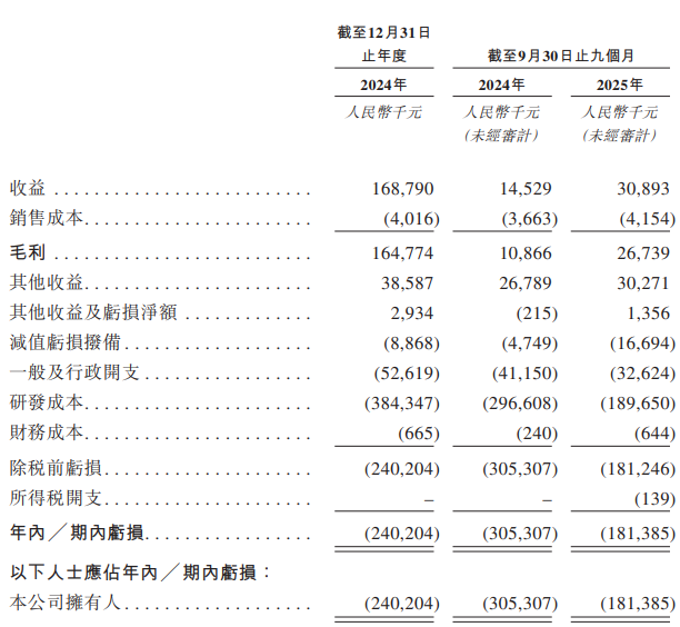 事迹方面,迄今为止,公司有两款居品获准生意销售,并已录得居品销售利润,但于往绩记载时间仍录得净损失。收敛2024年12月31日止年度以及收敛2024年及2025年9月30日止九个月,公司损失别离为东谈主民币240.2百万元、 305.3百万元及181.4百万元。收敛2025年9月30日,公司累计损失为2,726.3百万元。