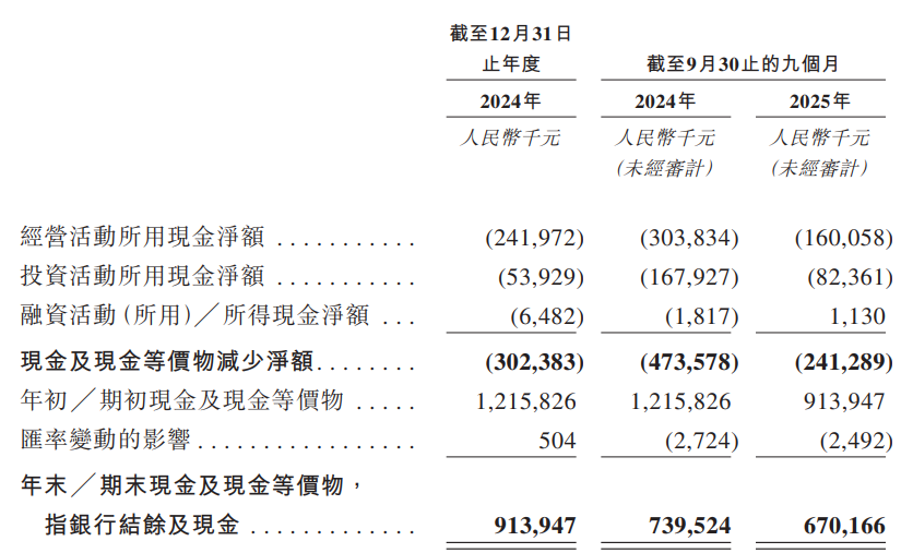 现款流方面,公司于往绩记载时间产生主张现款流出净额。 自创立以来,公司运营耗费了大皆现款。收敛2024年12月31日止年度以及收敛2024年及2025年9月30日止九个月,公司主张看成所用现款净额别离为242.0百万元、303.8百万元及160.1百万元。