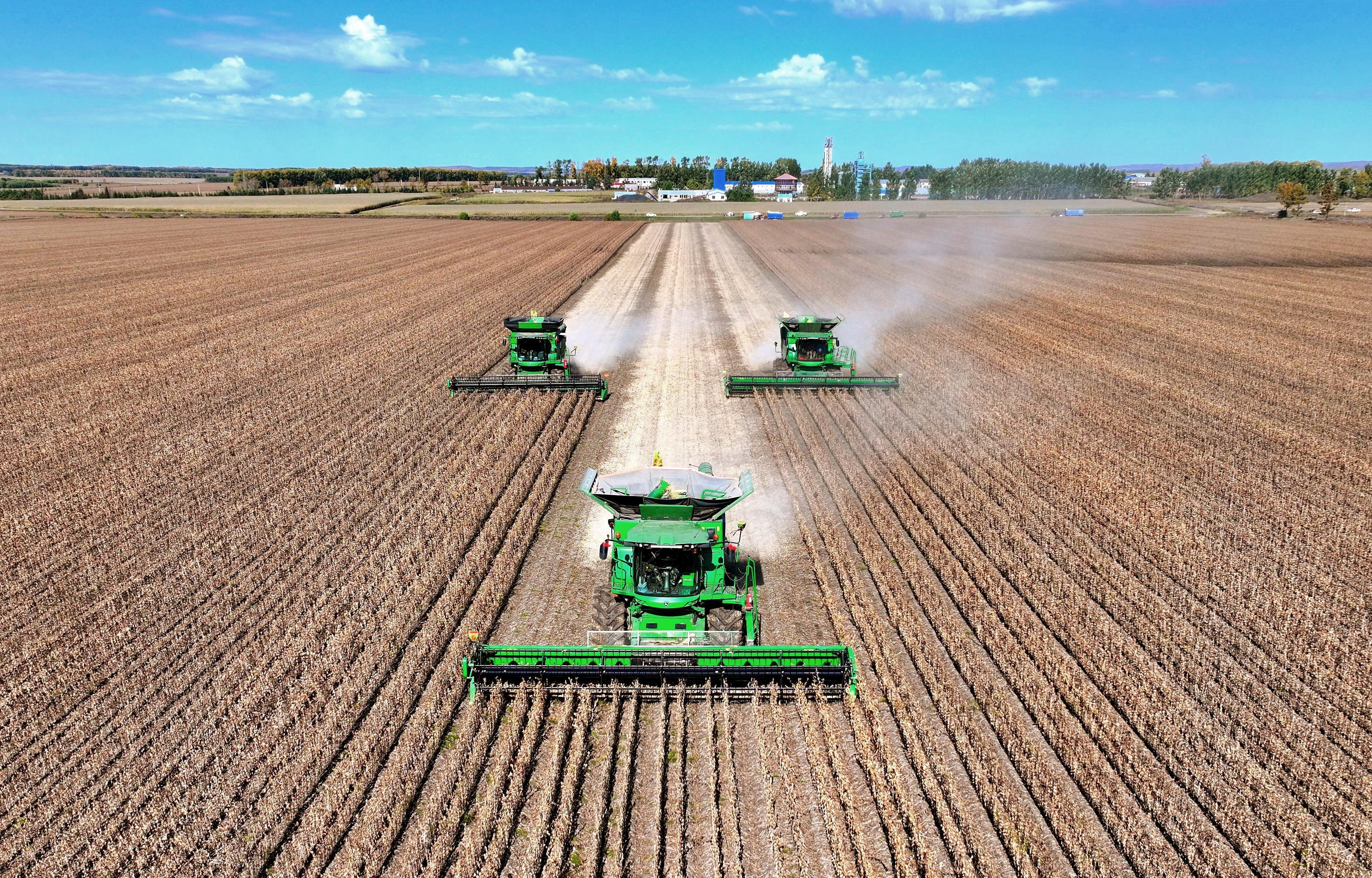 2025年9月29日,在北大荒集团黑龙江尾山农场有限公司第一处置区,农机进行大豆获利功课(无东谈主机相片)。
