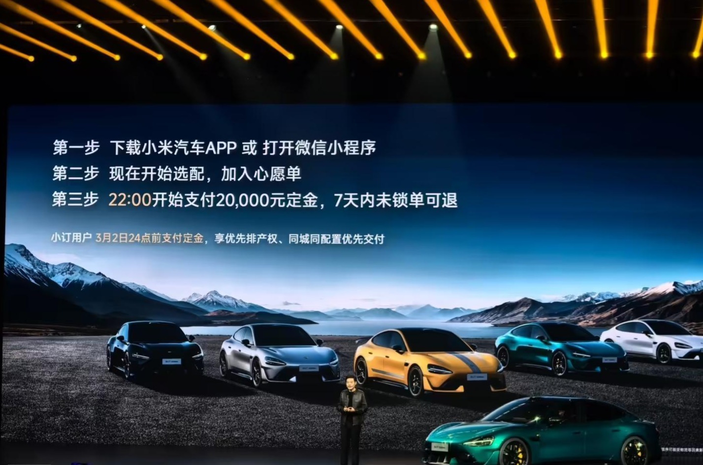 当天22:00起。用户只需支付2万元定金即可完成小订(3月2日前小订可享受优先排产权),7天内未锁单可退。小米还准备了部分小米SU7 Ultra现车,但仅有默许设置可选,小订用户今晚22:00 即可优先购买,其他用户明日10:00起可支付4万元下订,支付即锁单,无法退款。